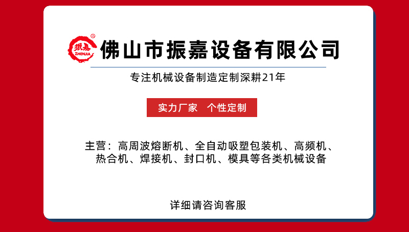 佛山市振嘉機械設備有限公司專業(yè)生產高周波機器,擁有自動化設備技術 21 年。我們是一家集研發(fā)、生產、銷售與售后為一體的生產廠家