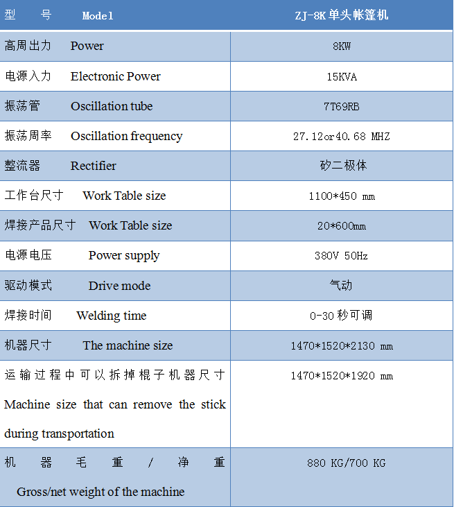 4000-618-233ZJ-8K單頭帳篷機,帳篷熱合高周波機主要控件均使用歐、美、日原裝進口元器件,具有較高的穩(wěn)定性,所有系統(tǒng)均為自主研發(fā)、制造。能根據(jù)不同的工件要求設(shè)計系統(tǒng)、模具等。分段式熔接、切斷,工件熔接后牢固性極強。